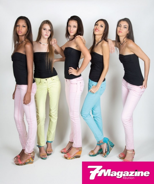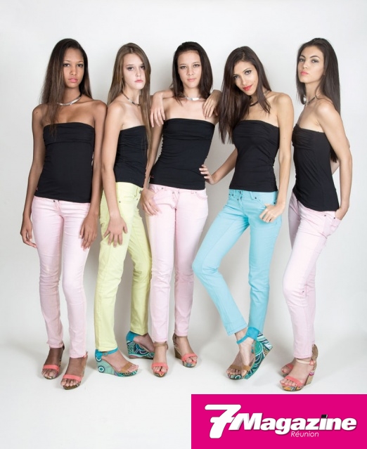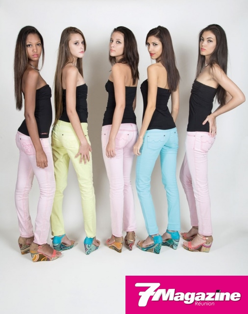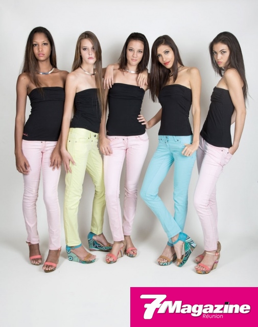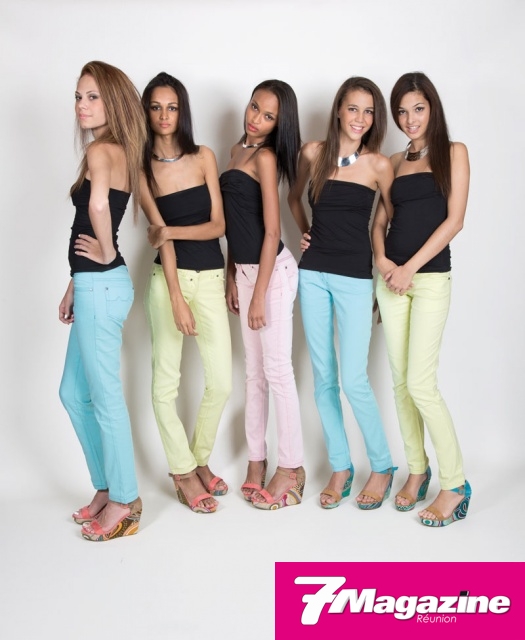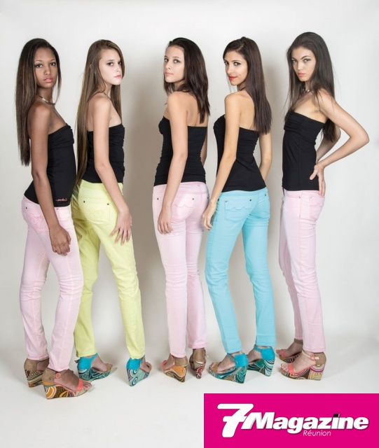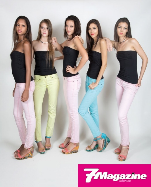 Les 10 finalistes Elite Model Look Réunion 2013, en jeans pastels Pardon, chaussures Jina assorties, ont sû sublimer leur look par l’éternel petit bustier si chic, signé Pardon. Pour la touche glamour, un ras-du-cou, signé Gold Center.