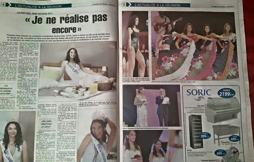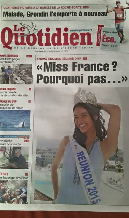 Miss Réunion 2015 fait encore parler d'elle ce lundi. La très belle Azuima Issa est en Une du Quotidien avec une interview et des photos à l'intérieur.