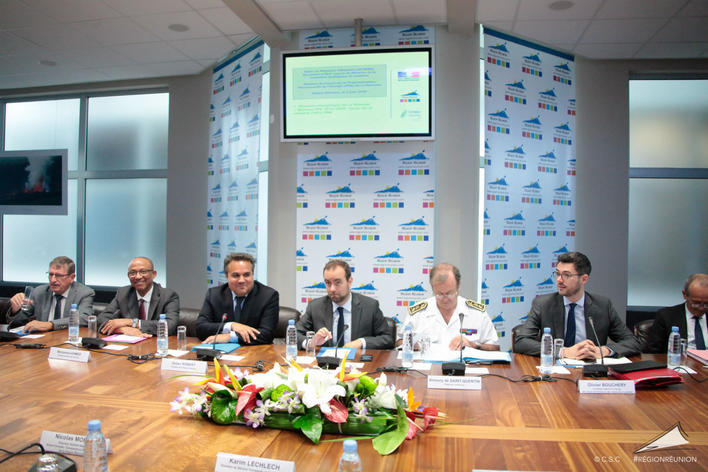 Cette visite s’est orientée vers 2 thématiques : les énergies renouvelables et l’aménagement du territoire. Une réunion de travail sur la Programmation Pluriannuelle de l’Énergie (PPE) s’est tenue au Conseil Régional ce mardi 5 juin. Cette réunion a été suivi d’une visite de terrain avec une présentation de l’Écocité du Territoire de la côte Ouest (TCO).
